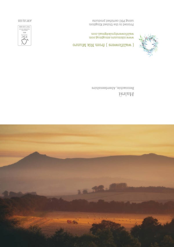 Photographic landscapes from over Aberdeenshire and surrounds. Printed on good quality smooth white board, packed in a recycled brown envelope.