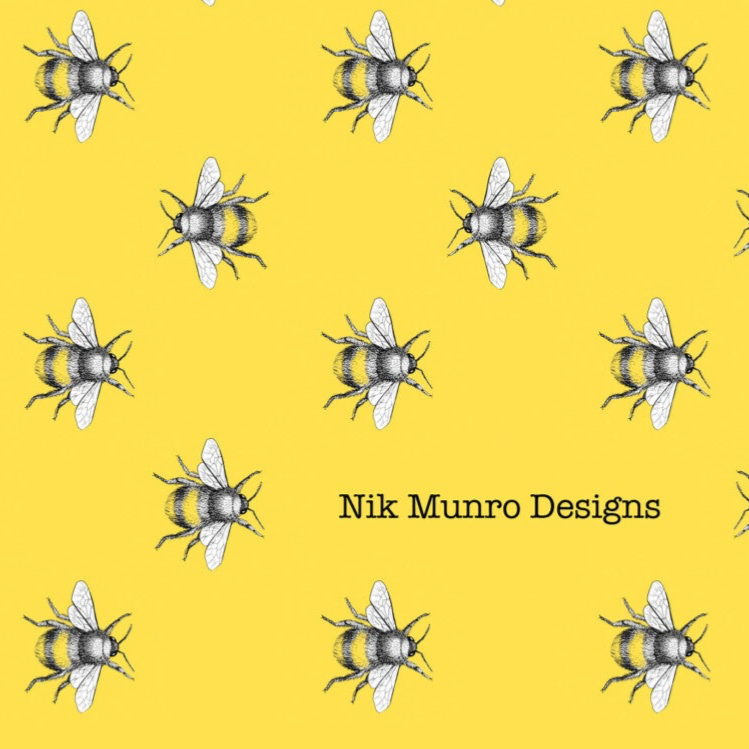 Black and white illustration of a bee on a yellow background.