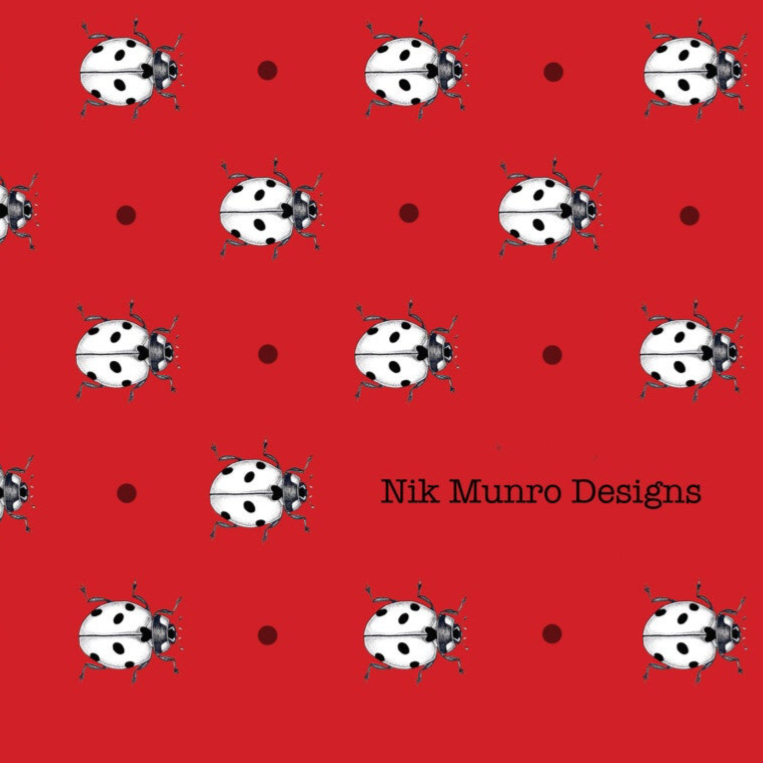 Black and white illustration of a ladybird/ladybug on a red background.