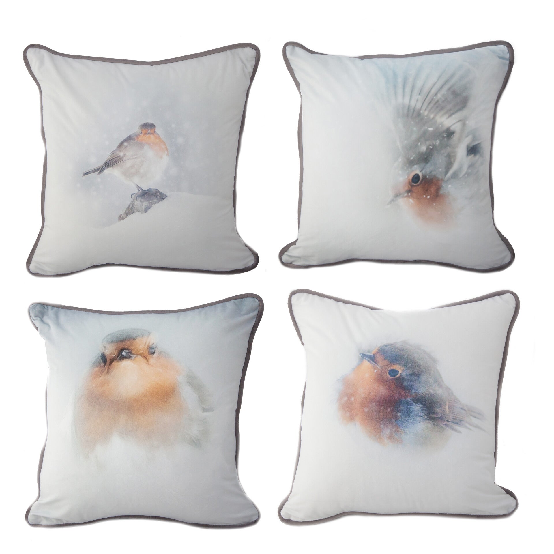 Luxury velvet cushion with sweet robin on the front, medium grey block colour on reverse.