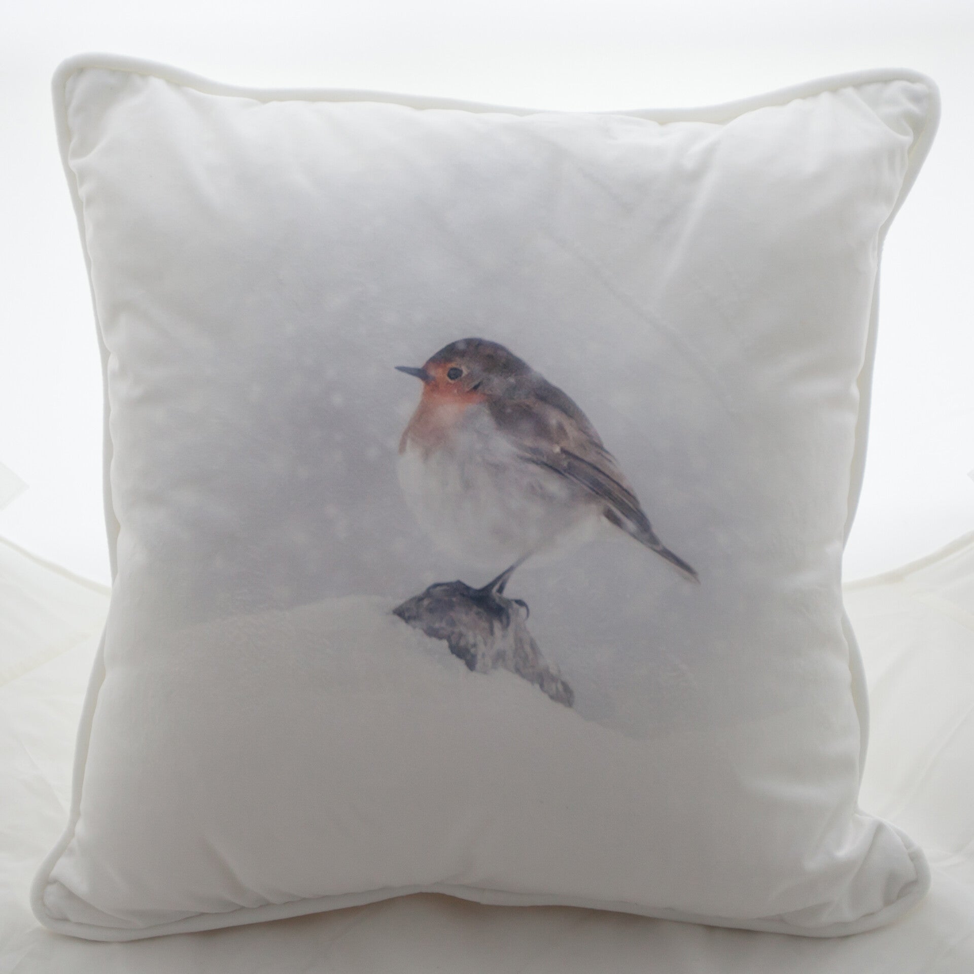 Luxury velvet cushion with bobbing robin on the front, medium grey block colour on reverse.