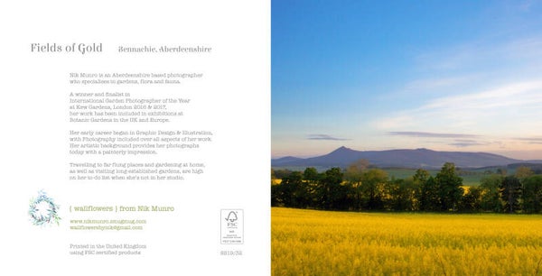 Photographic image of golden fields in front of Bennachie. Photographic landscapes from over Aberdeenshire and surrounds. Printed on high quality smooth white board, packed in a recycled brown envelope.