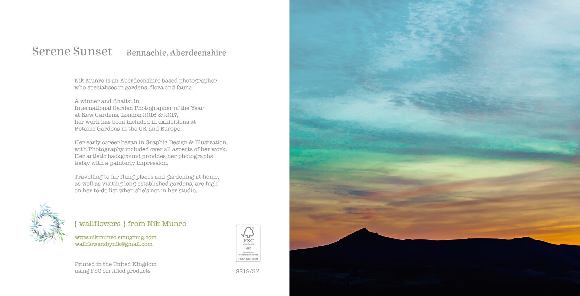 Photographic image of summer skies above Bennachie. Photographic landscapes from over Aberdeenshire and surrounds. Printed on high quality smooth white board, packed in a recycled brown envelope.