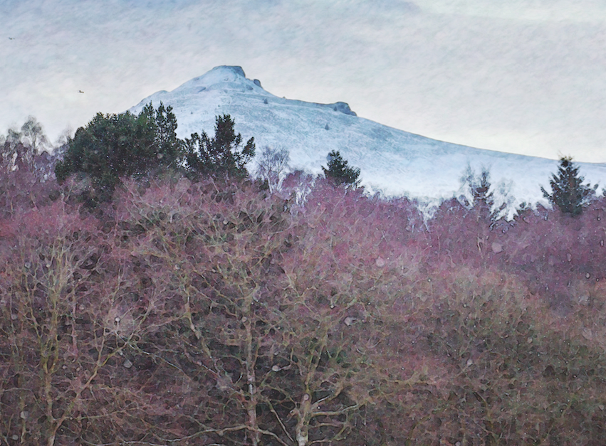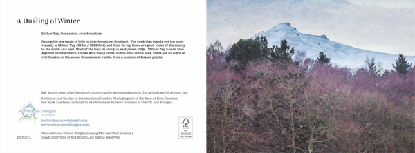 Mither Tap, Bennachie, Aberdeenshire on a winter's morning. Printed on watercolour-style board to add to the soft impression of the image. With a brown recycled envelope.