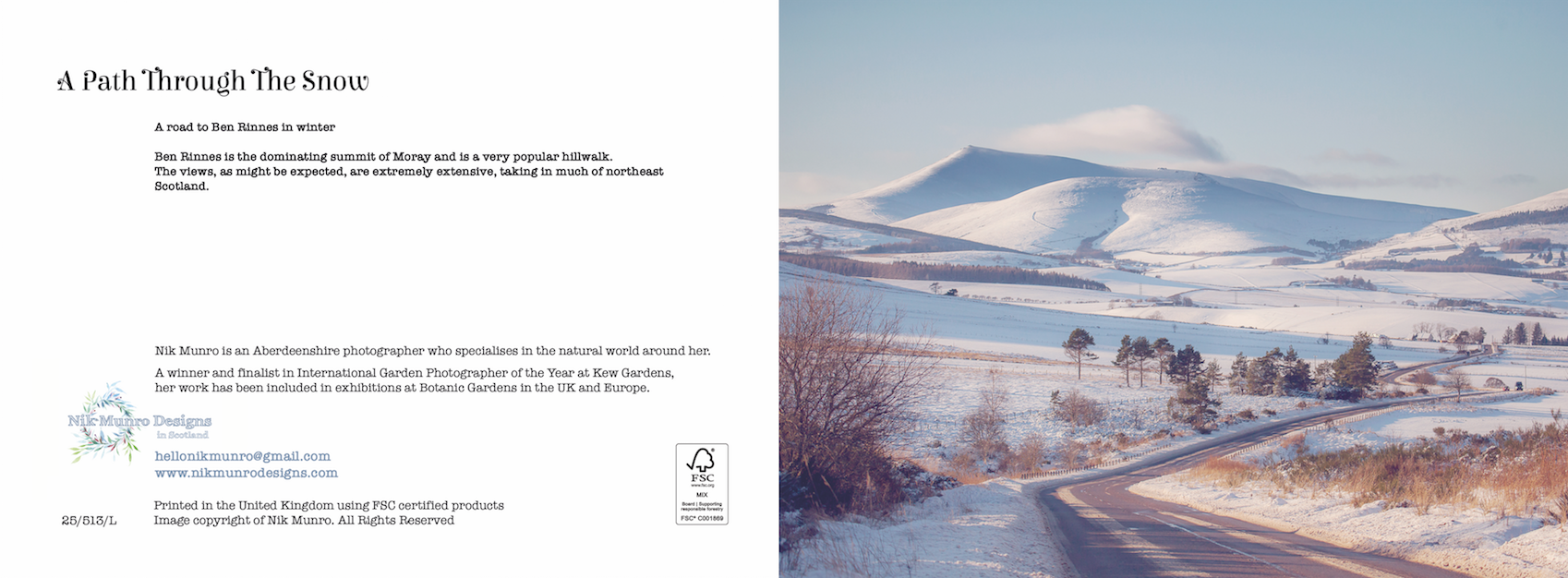 Country roads towards Ben Rinnes, Moray. Printed on smooth board to add to the soft, wintery impression of the image. With a brown recycled envelope.