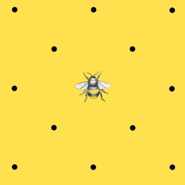 Black and white illustration of a bee in the centre, on a yellow background with black dots.