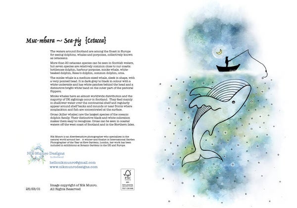 An illustrated image of marine themed cards. Printed on watercolour-style board. Available with and without Gaelic title on reverse.  With a brown recycled envelope.