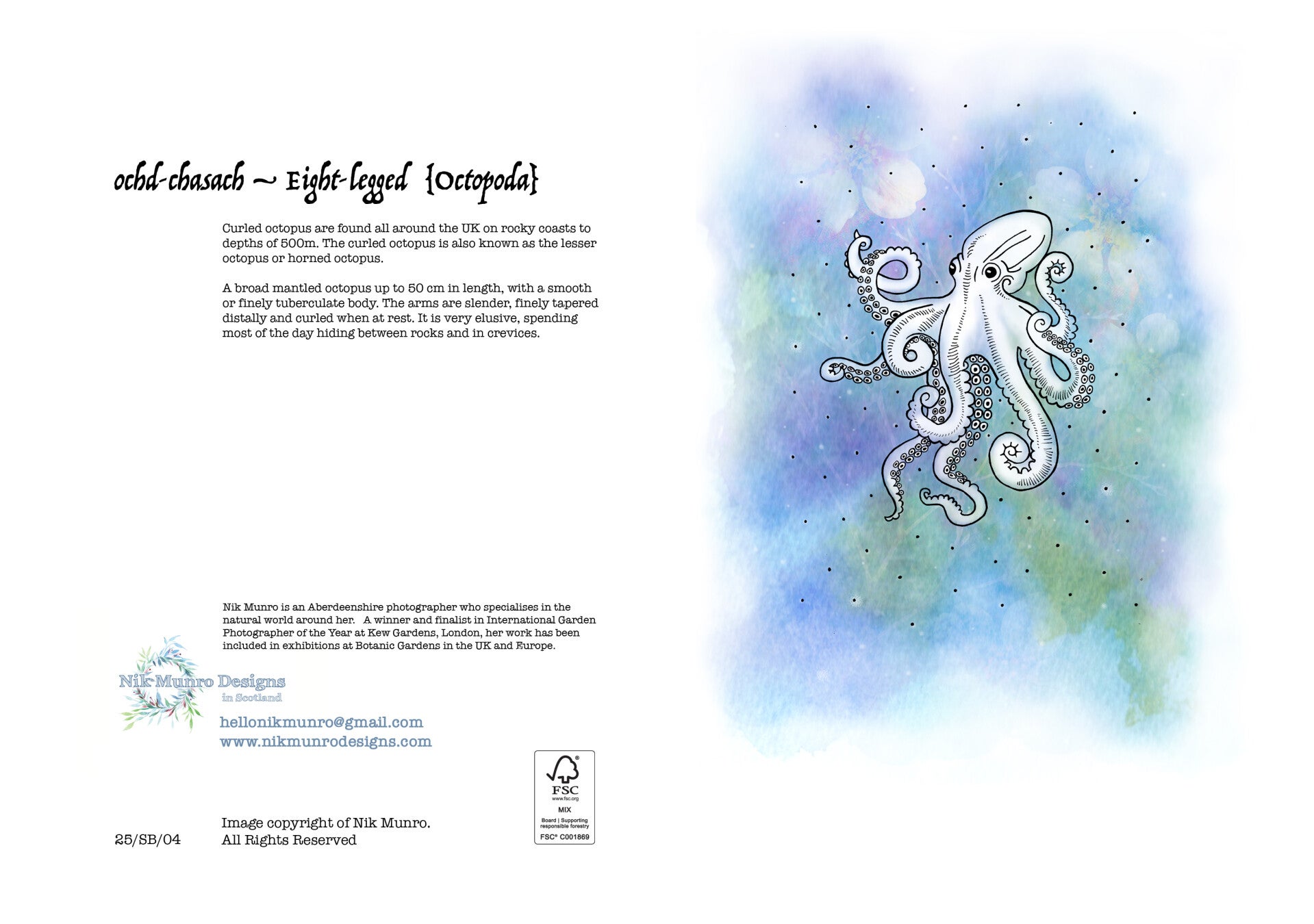 An illustrated image of marine themed cards. Printed on watercolour-style board. Available with and without Gaelic title on reverse.  With a brown recycled envelope.